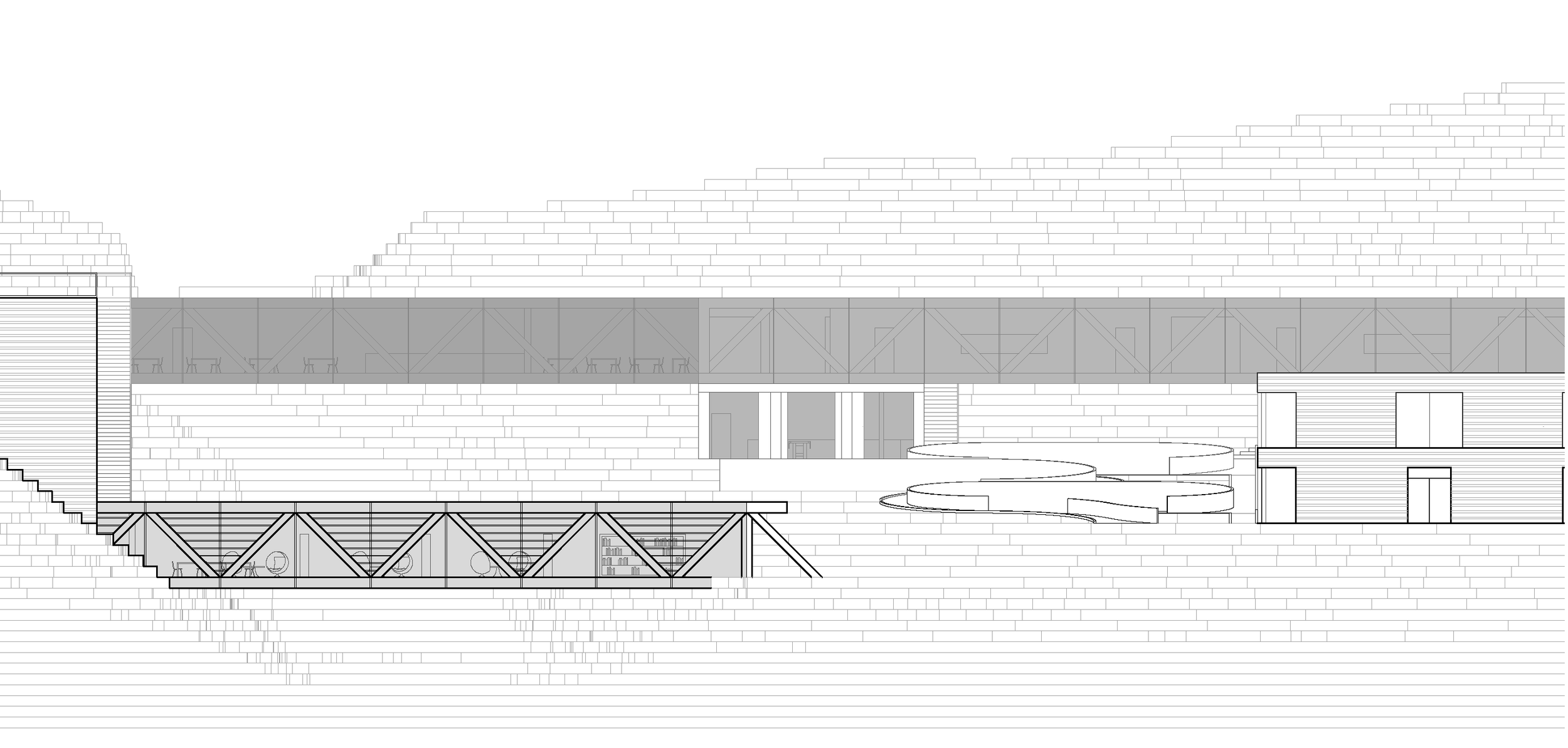 Elven som renner fra øst til vest deler tomten i to, og er en kvalitet som gir området et særpreg. For å utnytte denne kvaliteten ble fokuset satt på elven ved å bygge på hver side av den. Dette ønsket impliserte et krav om tilgjengelighet på tvers av elven, løst ved hjelp at to fire meter høye fagverkskonstruksjoner. Disse ble, i tillegg til å skape tilgjengelighet over elven, konstruksjoner som rommer bibliotek i vest og lærerværelse og et klasserom i øst. Fagverkets utforming sørger for store åpninger i den innglasserte fasaden som gir et transparent og lett uttrykk. Grepet skaper transparens og et lett uttrykk som respekterer elven og dens naturlige retning, samtidig som den gjorde elven til et sentralt blikkfang.