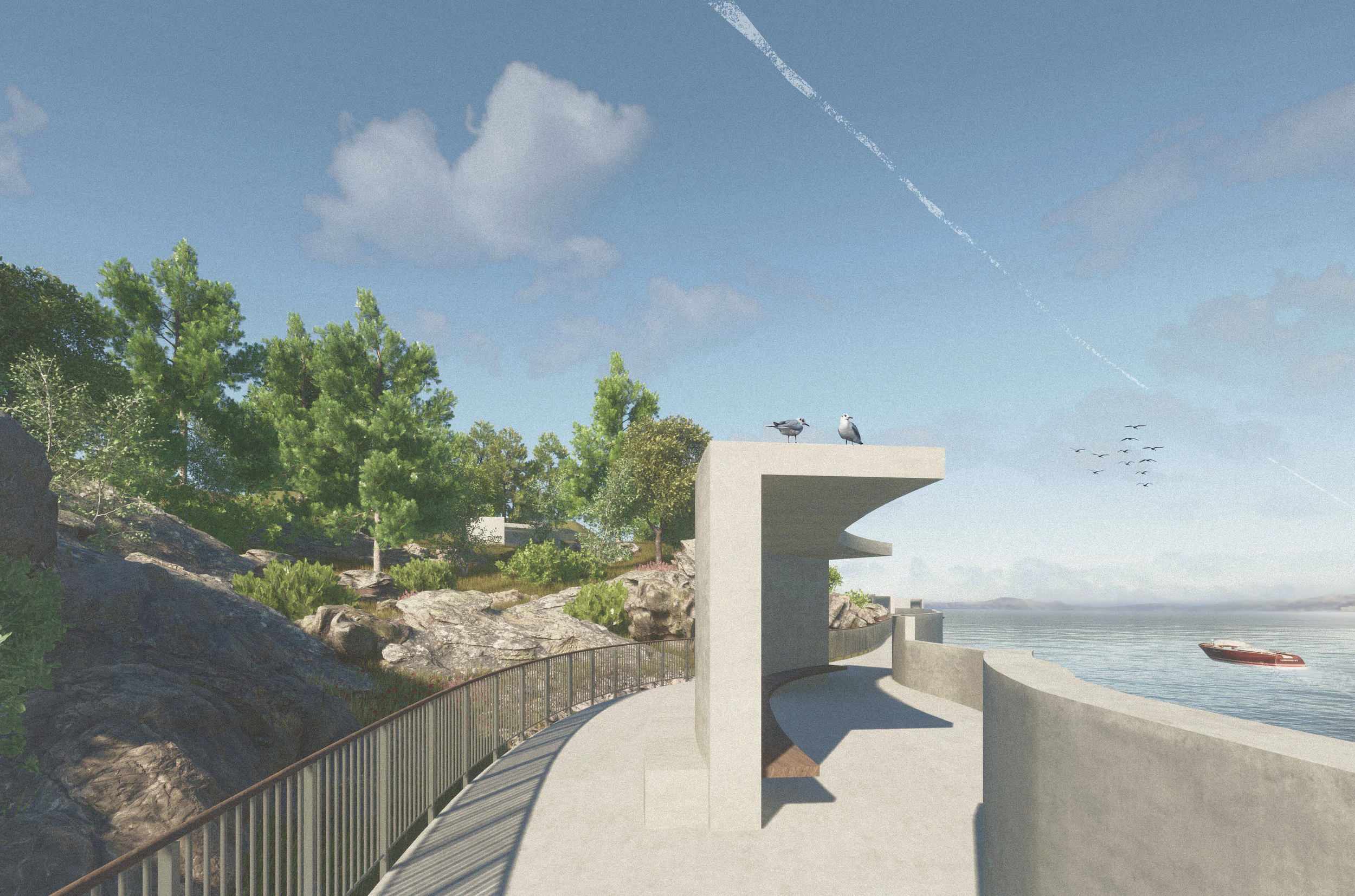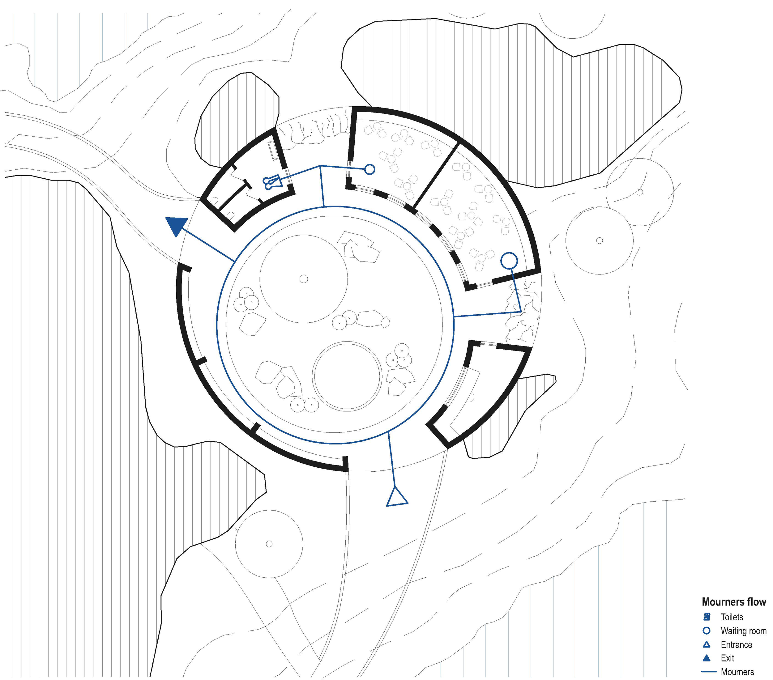 Bygningene er sammenkoblet gjennom et nettverk av stier som slynger seg gjennom landskapet. Langs stiene ligger seks Kolumbarier hvor asken til den avdøde kan plasseres og besøkes i ettertid. Kolumbariene signaliserer til de vanlige besøkende at de entrer komplekset. Møtet mellom de forskjellige brukerne av øya forebygger fremmedgjørelsen av Krematoriet og skaper en mykere overgang mellom områdene. Stinettverket leder videre til Det sosiale bygget, egnet for sammenkomster etter seremonien. Bygningen er åpen for alle øyas besøkende, men er delt i to av et innglassert atrie for å skape en fysisk barriere, men tillate for en visuell forbindelse.