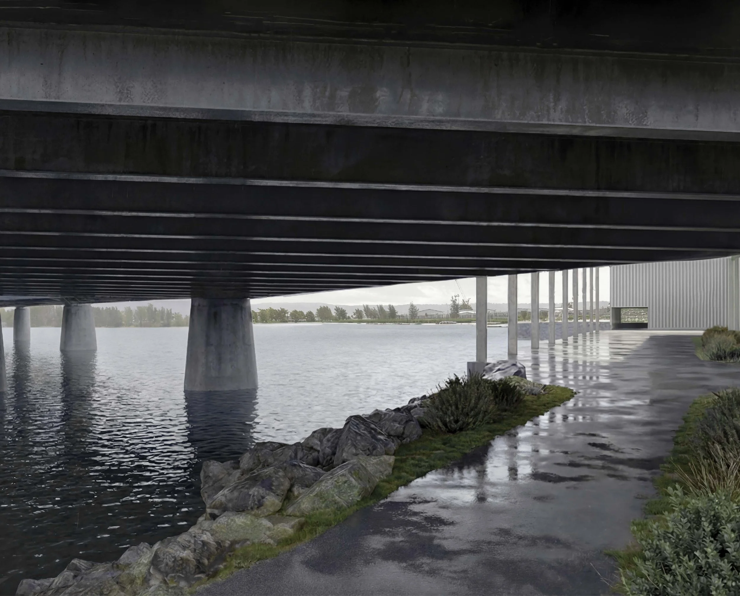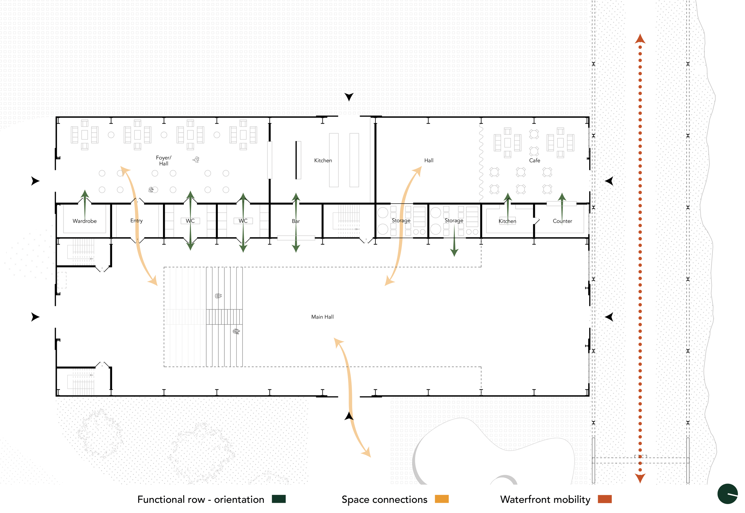 Det sammenhengende plassrommet langs vannkanten binder sammen de forskjellige delene i prosjektet, åpner det som tidligere var utilgjengelige områder for offentligheten. Strandlinjen kobler seg på byens overordnede gangforbindelser og blir del av Drammens utbredte nettverk av stier langs vannkanten. Den knytter marinaen, kulturarenaen, flerbrukshallen og parken sammen i en helhetlig sekvens, samtidig som spor av stedets industrielle historie synliggjøres langs vannkanten. Rommet beriker hverdagens bevegelser og skaper nye måter å oppleve Holmen på som en levende og tilgjengelig del av byen.