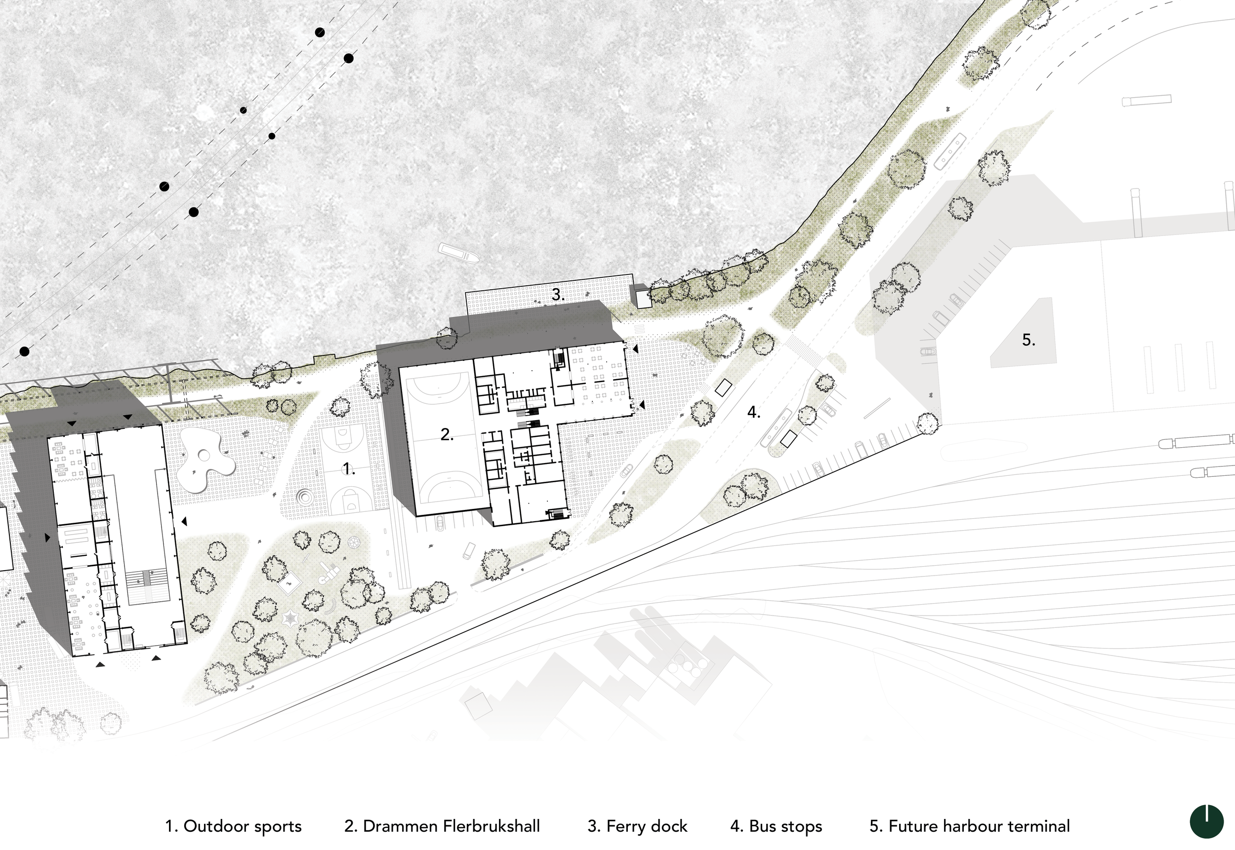 Prosjektet er lokalisert på Holmen – en havneøy i Drammen som får en stadig mer sentral rolle i byen. Gjennom fem arkitektoniske inngrep transformeres eksisterende bygninger og uteområder, bundet sammen av en ny, offentlig sjøpromenade. Samlet tilfører grepene kulturelle, sosiale og rekreative funksjoner, åpner strandlinjen for allmennheten og viser en måte å utvikle havneområder på som tar vare på stedets industrielle identitet.