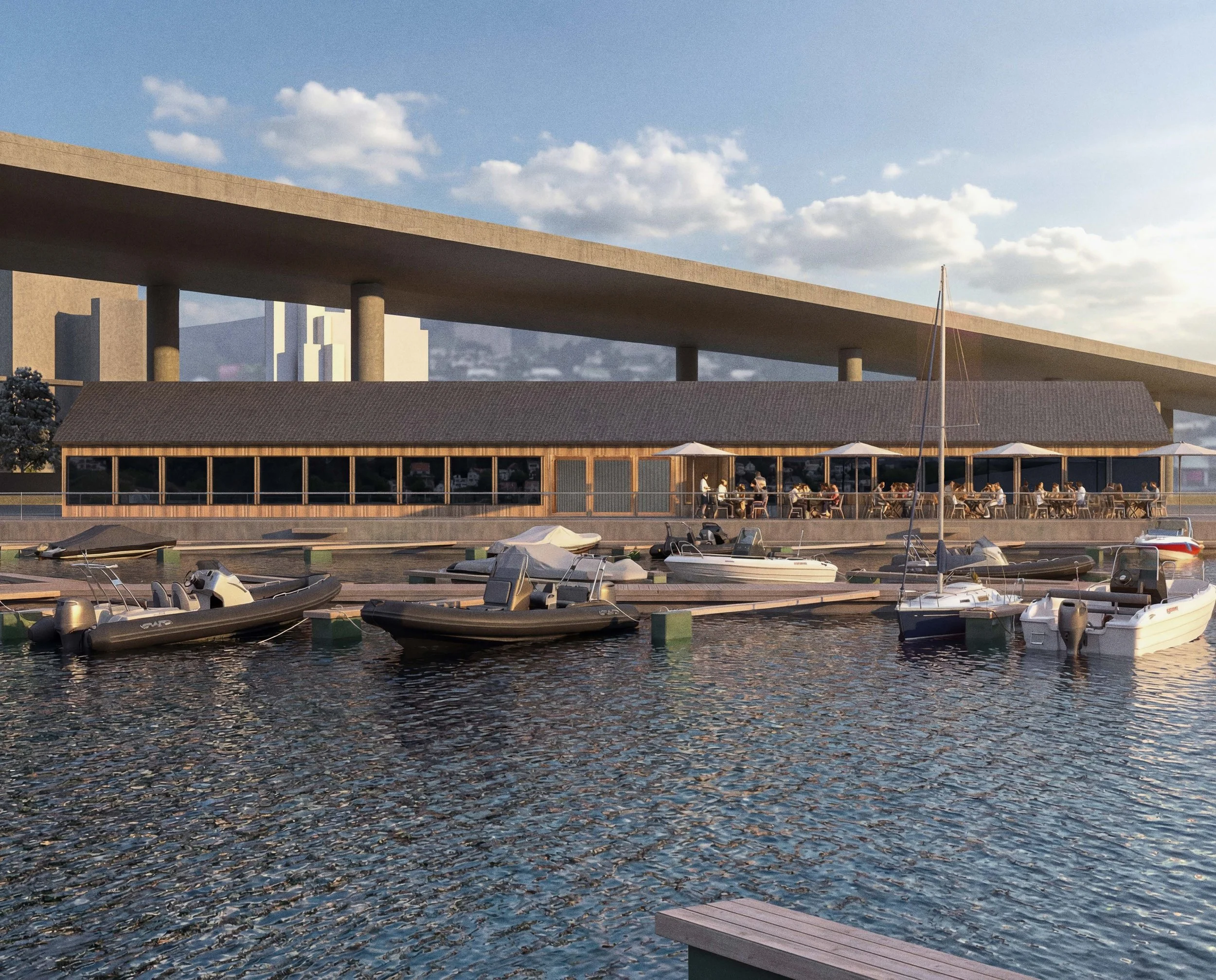 Holmen Marina transformeres til et sted man ankommer, ikke bare passerer gjennom. Prosjektet gir båtkulturen i byen en sterkere offentlig tilknytning, og marinaen en ny sosial tilstedeværelse i byen. Prosjektet gjør plassen til et samlingspunkt, en aktiv kant der sport, sosiale møteplasser og havnens kultur møtes.
